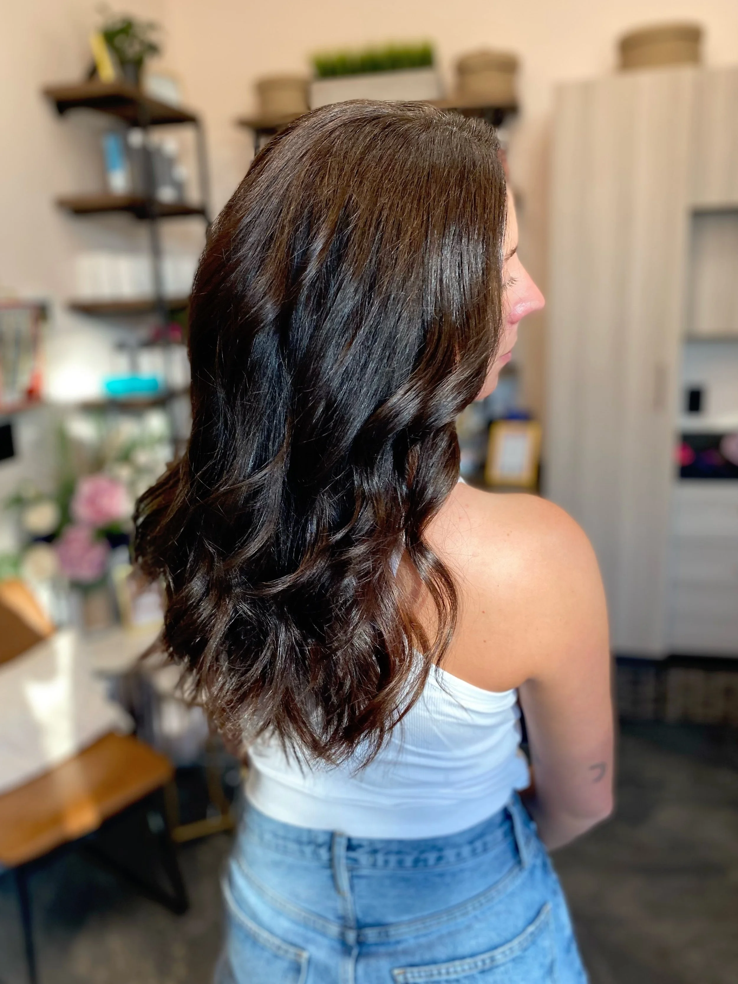 $785 Initial Application & Hair Cost | Glossing Treatment & 1 row of 18-20” Hand Tied Extensions
